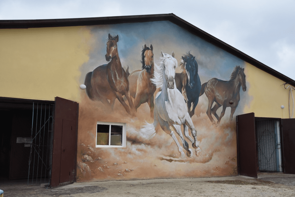 Особое внимание привлекает роскошный мурал на одной из конюшен конной школы в Сумах: табун элегантных скакунов поднимается в воздух, их золотистые гривы развеваются в небесах. Как рассказал Александр Стрельченко, это произведение искусства создали местные художники Евгений Осипенко и Егор Авдеенко. По просьбе дирекции они более двух недель работали над созданием этого шедевра.